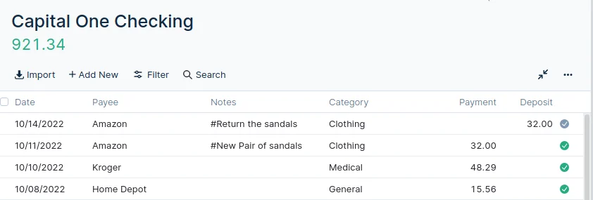 I didn't like those sandals as much as I thought I did. They made my feet look big. So I decided to return them a few days later. To enter the return, I fill out a nearly identical transaction in the account that will be credited. In my case, I had Amazon put the money back on my Debit card. Instead of putting the return amount in the payment column, I've entered the amount in the Deposit column. I also made sure that I chose Clothing as my category.